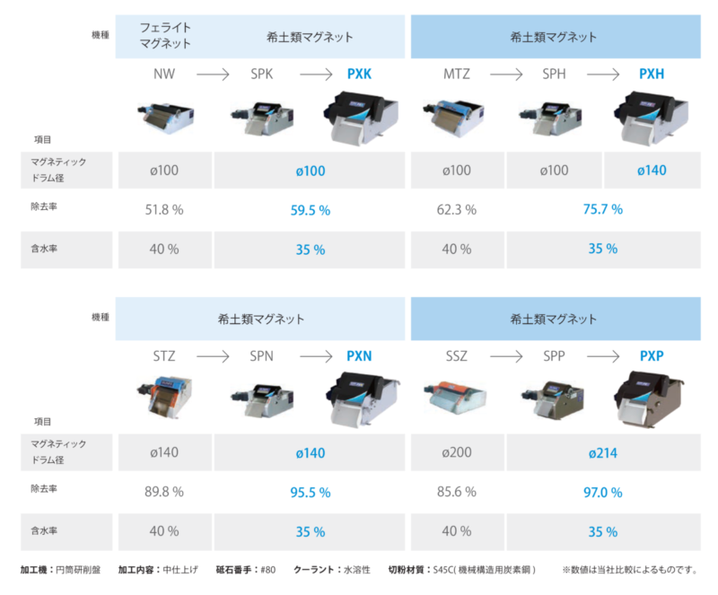 - マグネットの磁力やマグネティックドラム径の異なる4機種をラインナップしています。お客様の加工条件や必要な濾過精度に合わせて最適なセパレーターを選定することが可能です。