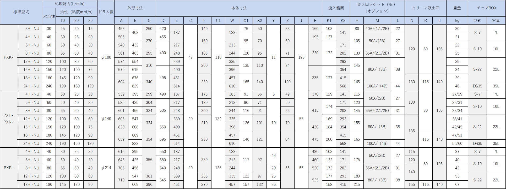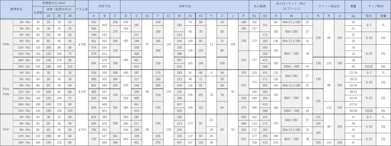- PXP φ214の大径ドラムによる精密濾過や1000L/minの大流量処理に対応したハイエンドモデル
